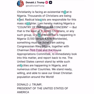 The Federal Government of Nigeria notes the recent remarks by U.S. President Donald J. Trump alleging large-scale killings of Christians in Nigeria and calling for the country’s designation as a “Country of Particular Concern.”
